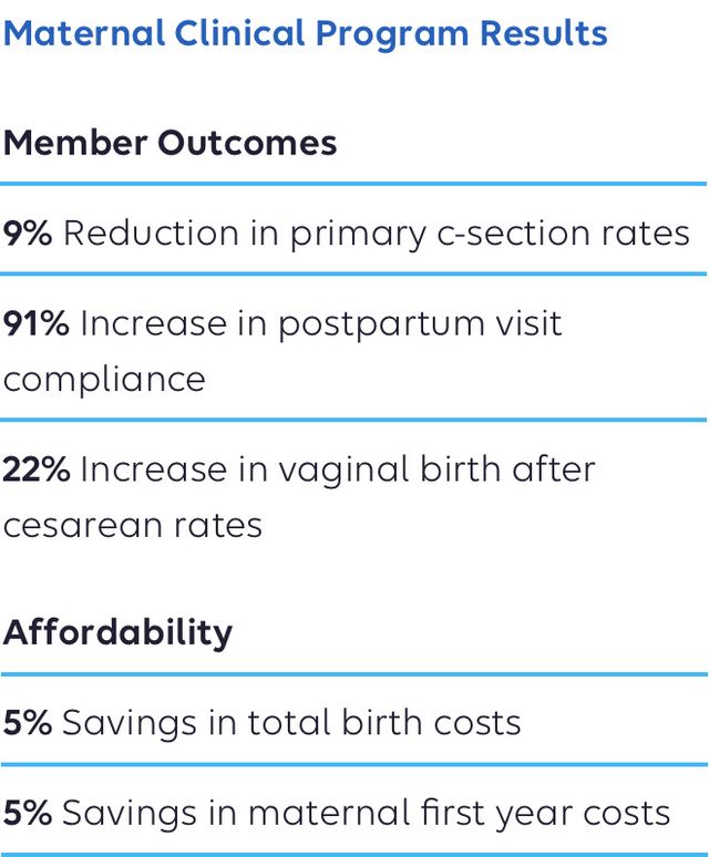 In 2022, we launched a maternal clinical program with our health plan affiliates to deploy obstetric specialty practice consultants into care provider practices across 22 Medicaid markets, with 10 of those markets having a joint commercial footprint. This program is already showing great results and yielding cost savings.